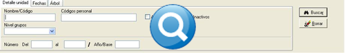 Nombre/Código. En esta casilla, usted podrá introducir todo o parte del nombre o código principal de los grupos que desee buscar. La aplicación buscará coincidencias en el nombre o código de los grupos, seleccionando aquellos que contengan total o parcialmente el texto que usted haya introducido en esta casilla.