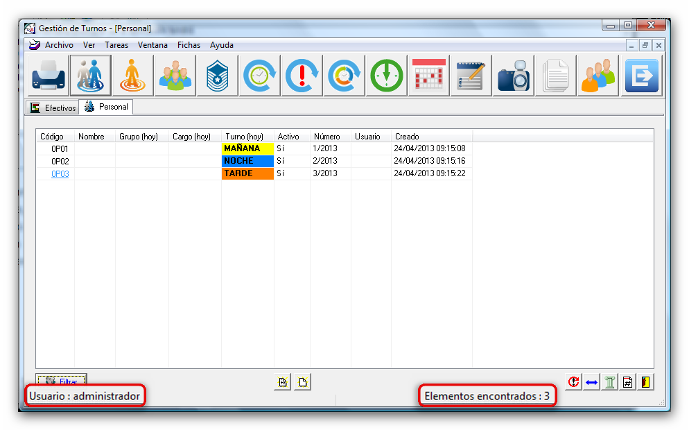 En la base de la ventana principal de la aplicación se muestra cierta información adicional. En la parte inferior izquierda de esta ventana, usted podrá ver en todo momento el código de usuario correspondiente al usuario con el que usted ha accedido actualmente a la aplicación. Además, siempre que la aplicación esté mostrando en primer plano alguna tabla o lista (excepto las del módulo Efectivos), en la parte inferior derecha de esta ventana se indica el número de elementos que está mostrando actualmente dicha tabla o lista.